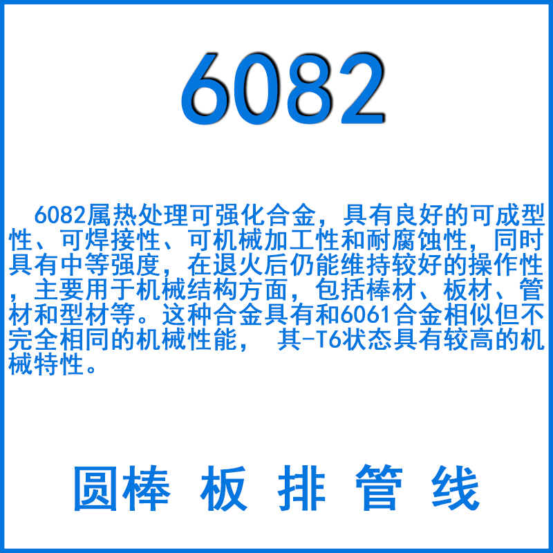 6082屬熱處理可強(qiáng)化合金,具有良好的可成型性、可焊接性、可機(jī)械加工性和耐腐蝕性,同時(shí)具有中等強(qiáng)度,在退火后仍能維持較好的操作性,主要用于機(jī)械結(jié)構(gòu)方面,包括棒材、板材、管材和型材等。這種合金具有和6061合金相似但不完全相同的機(jī)械性能, 其-T6狀態(tài)具有較高的機(jī)械特性。合金6082在歐洲是很常用的合金產(chǎn)品,在美國(guó)也有很高的應(yīng)用,適用于加工原料,無(wú)縫鋁管,結(jié)構(gòu)型材和定制型材等。6082合金通常具有很好的加工特性和很好的陽(yáng)極反應(yīng)性能。最常用的陽(yáng)極反應(yīng)方法包括去除雜質(zhì)和染色,涂層等。