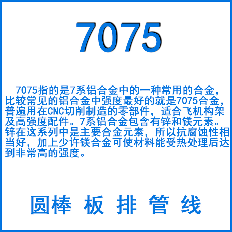 7075指的是7系鋁合金中的一種常用的合金,比較常見的鋁合金中強度最好的就是7075合金,普遍用在CNC切削制造的零部件,適合飛機構架及高強度配件。7系鋁合金包含有鋅和鎂元素。鋅在這系列中是主要合金元素,所以抗腐蝕性相當好,加上少許鎂合金可使材料能受熱處理后達到非常高的強度。