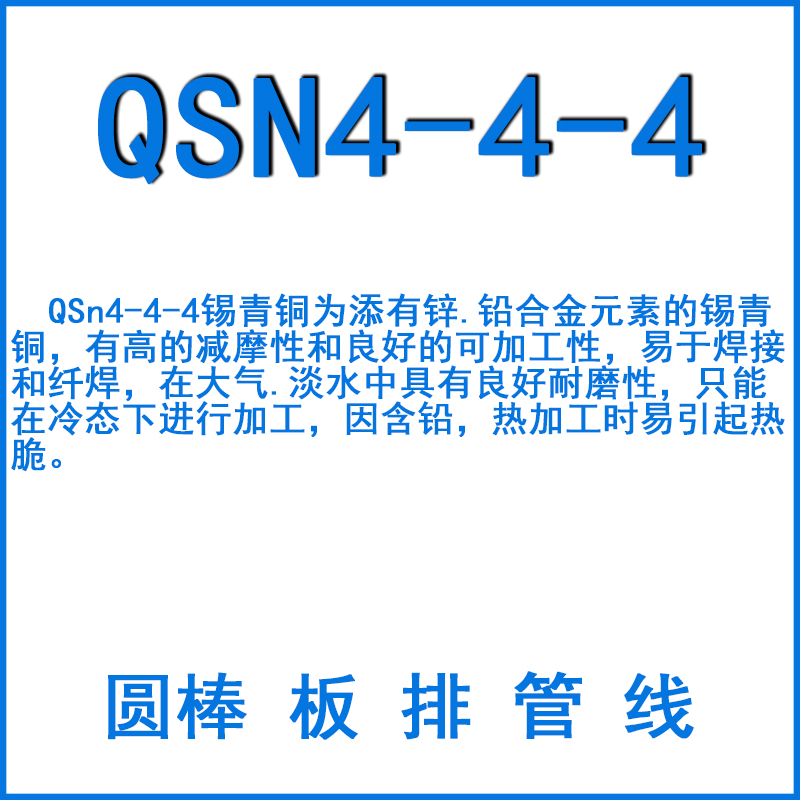 QSn4-4-4錫青銅為添有鋅.鉛合金元素的錫青銅,有高的減摩性和良好的可加工性,易于焊接和纖焊,在大氣.淡水中具有良好耐磨性,只能在冷態下進行加工,因含鉛,熱加工時易引起熱脆。