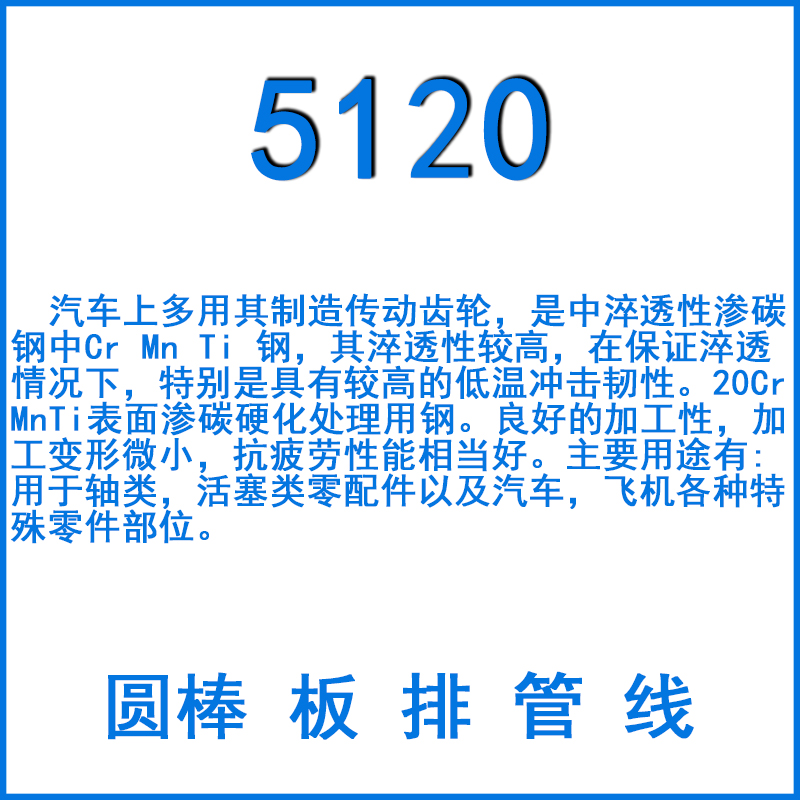 5120是滲碳鋼,滲碳鋼通常為含碳量為0.17%-0.24%的低碳鋼。汽車上多用其制造傳動(dòng)齒輪,是中淬透性滲碳鋼中Cr Mn Ti 鋼,其淬透性較高,在保證淬透情況下,特別是具有較高的低溫沖擊韌性。5120表面滲碳硬化處理用鋼。良好的加工性,加工變形微小,抗疲勞性能相當(dāng)好。主要用途有:用于軸類,活塞類零配件以及汽車,飛機(jī)各種特殊零件部位。