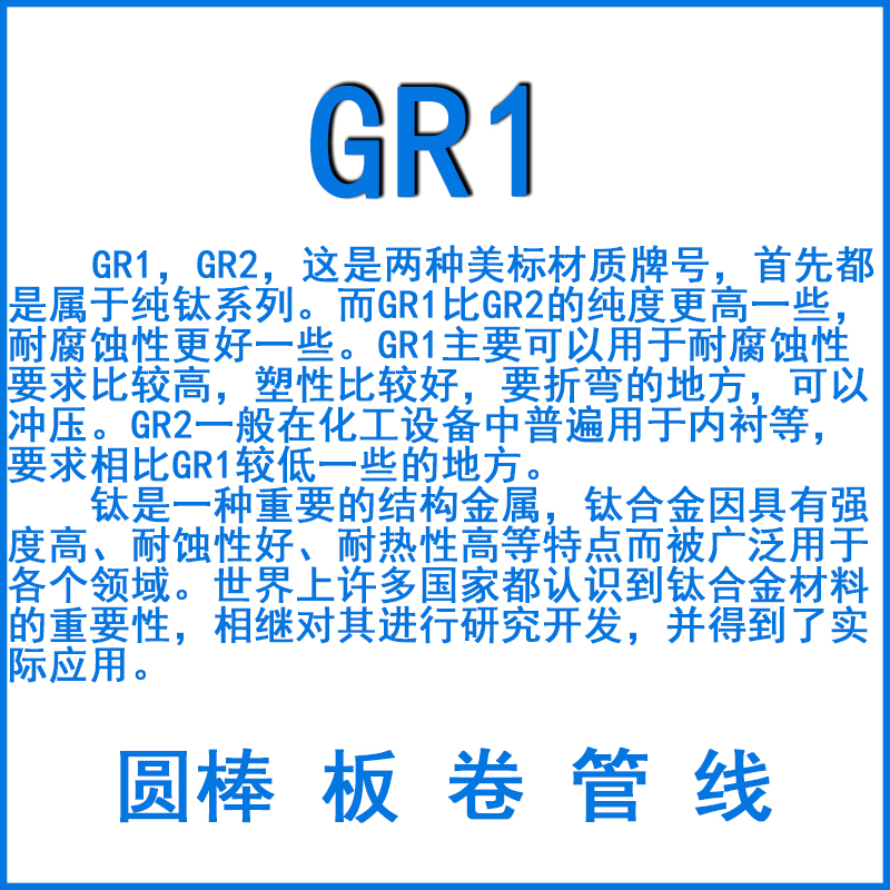 GR1,GR2,這是兩種美標(biāo)材質(zhì)牌號,首先都是屬于純鈦系列。而GR1比GR2的純度更高一些,耐腐蝕性更好一些。GR1主要可以用于耐腐蝕性要求比較高,塑性比較好,要折彎的地方,可以沖壓。GR2一般在化工設(shè)備中普遍用于內(nèi)襯等,要求相比GR1較低一些的地方。