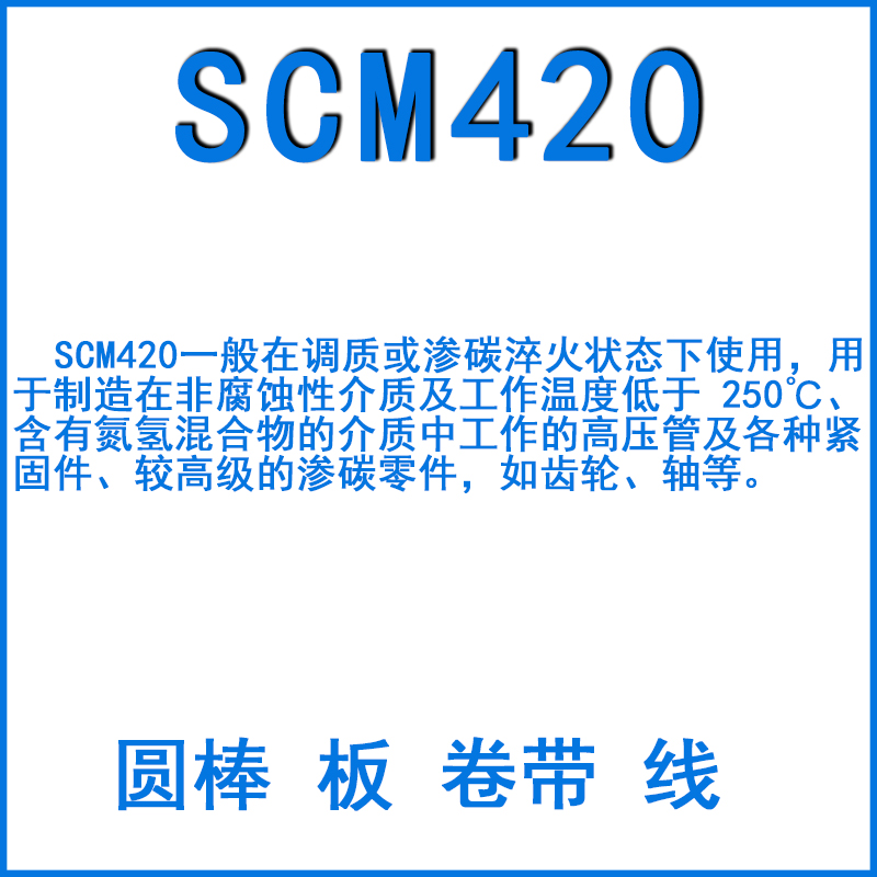 SCM420一般在調質或滲碳淬火狀態下使用,用于制造在非腐蝕性介質及工作溫度低于 250℃、含有氮氫混合物的介質中工作的高壓管及各種緊固件、較高級的滲碳零件,如齒輪、軸等。